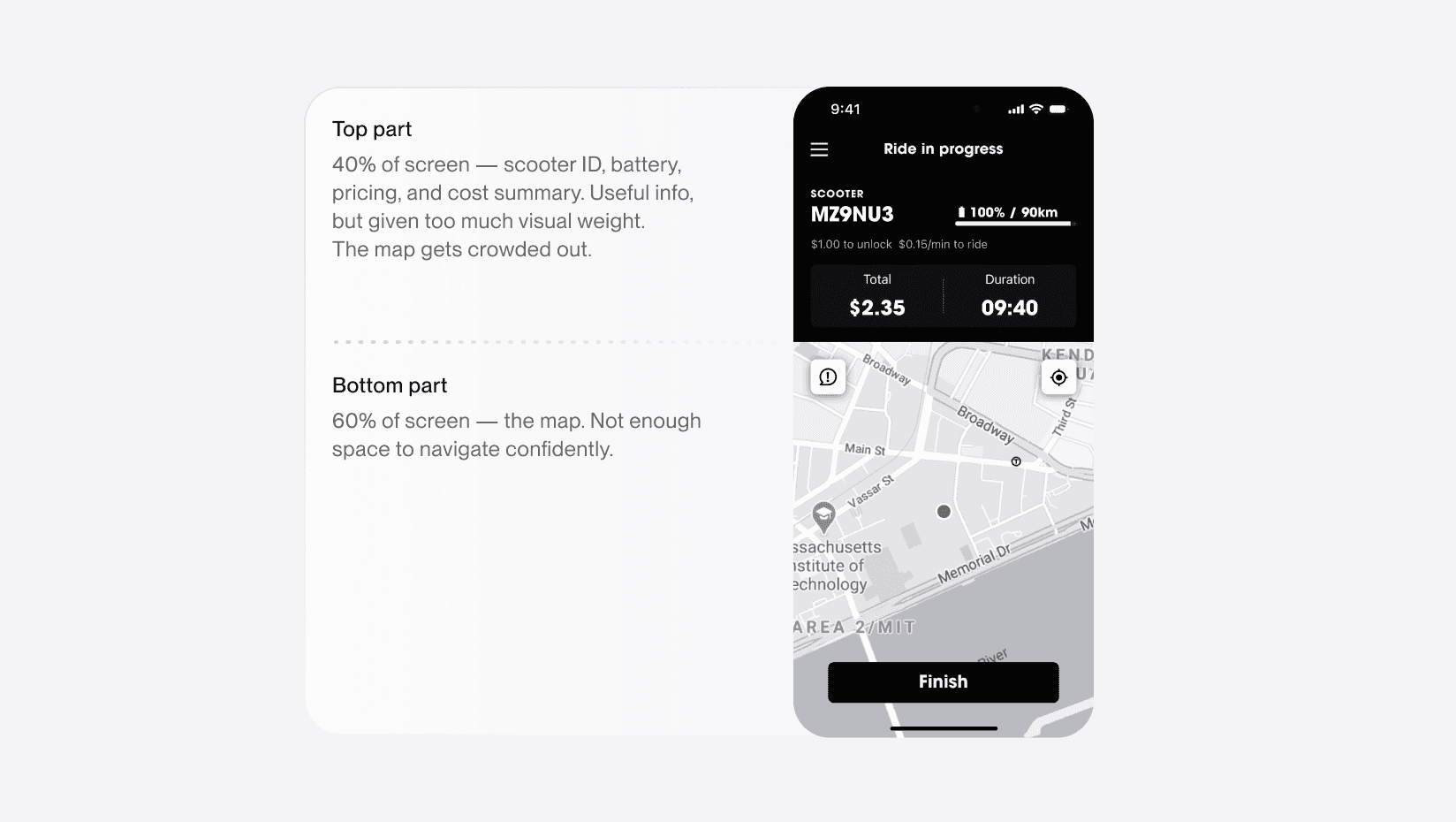 The ride screen is open for the entire duration of a trip. It needs to show speed, battery, cost, time, and the map — all readable in a single glance, the moment a rider stops to check.