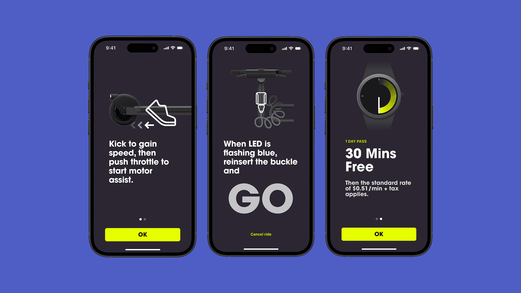 I joined the product design team for about a year. My work spanned the core ride interface, geofence zone visualization, onboarding, and ride passes — all with one defining constraint: every interaction happens outdoors, in short bursts, often in an unfamiliar part of the city. Riders pull out their phone for a few seconds — and need an answer immediately.